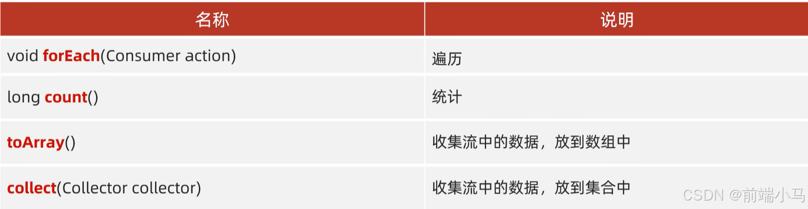 ArrayList<String> list = new ArrayList<>(); Collections.addAll(list,"1","2","3","4","5"); //void forEach(Consumer action) 遍历 list.stream().forEach(s -> System.out.println(s)); //long count() 统计 long num= list.stream().count(); System.out.println( num); //toArray() 收集流中的数据,放到数组中 Object[] arr1=list.stream().toArray(); System.out.println(Arrays.toString(arr1)); //IntFunction的泛型:具体类型的数组 //apply的形参:流中数据的个数,要跟数组的长度保持一致 //apply的返回值:具体类型的数组 //方法体:就是创建数组 //toArray方法的参数的作用:负责创建一个指定类型的数组 //toArray方法的底层,会依次得到流里面的每一个数据,并把数据放到数组当中 // toArray方法的返回值:是一个装着流里面所有数据的数组 String[] arr2=list.stream().toArray(new IntFunction<String[]>() { @Override public String[] apply(int value) { return new String[value]; } }); System.out.println(Arrays.toString(arr2)); String[] arr3=list.stream().toArray(value -> new String[value]); System.out.println(Arrays.toString(arr3));//collect(Collector collector) 收集流中的数据,放到集合中 //注意点:如果我们要收集到Map集合中,键不能重复,否则会报错 ArrayList<String> list = new ArrayList<>(); Collections.addAll(list, "张无忌-男-15", "周芷若-女-14", "张三-男-23", "小昭-女-18", "李四-男-21"); //收集list集合当中 //需求:把所有男性收集起来 List<String> newList1 = list.stream() .filter(s -> "男".equals(s.split("-") [1])).collect(Collectors.toList()); System.out.println(newList1); //收集Set集合当中 //需求:把所有男性收集起来 Set<String> newList2 = list.stream().filter (s -> "男".equals(s.split("-")[1])).collect (Collectors.toSet()); System.out.println(newList2); //收集Map集合当中 //谁作为键,谁作为值 //我要把所有的男性手机起来 //键:姓名 值:年龄 张无忌-男-15 /* toMap:参数一表示键的生成规则 参数二表示值的生成规则 参数一: Function泛型一:表示流中每一个数据的类型 泛型二:表示Map集合中键的数据类型 方法apply形参:依次表示流里面的每一个数据 方法体:生成键的代码 返回值:已经生成的键 参数二:Function泛型一:表示流中每一个数据的类型 泛型二:表示Map集合中值的数据类型 方法apply形参:依次表示流里面的每一个数据 方法体:生成值的代码 返回值:已经生成的值 */ Map<String, Integer> map = list.stream().filter(s -> "男" .equals(s.split("-")[1])) .collect(Collectors.toMap( new Function<String, String>() { @Override public String apply(String s) { return s.split("-")[0]; } }, new Function<String, Integer>() { @Override public Integer apply(String s) { return Integer.parseInt(s.split("-")[2]); } } )); System.out.println(map); Map<String, Integer> map2 = list.stream().filter (s -> "男".equals(s.split("-")[1])) .collect(Collectors.toMap( s -> s.split("-")[0], s -> Integer.parseInt(s.split("-")[2]) )); System.out.println(map2);