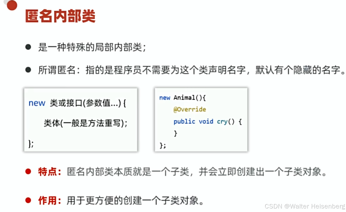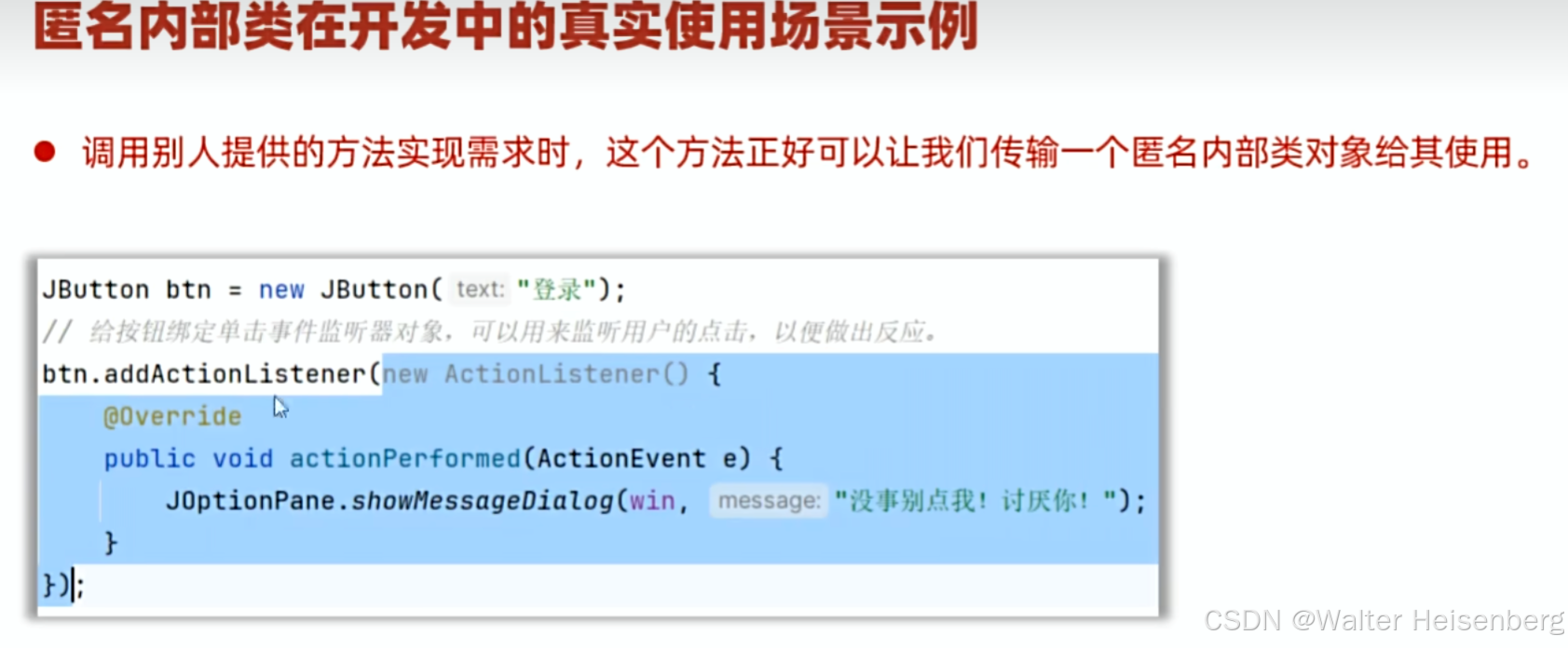 也就是说,是我们利用别人提供的方法,选择使用匿名内部类简化代码(方法需要我们用,不是我们主动使用)