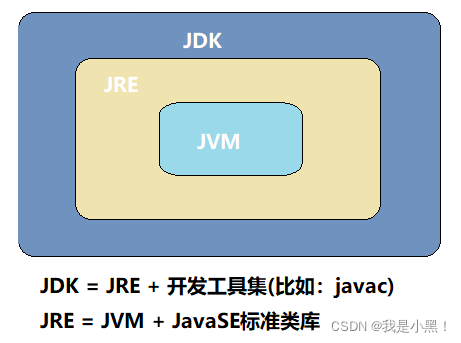 JRE(Java Runtime Environment):指java运行环境,包含JVM虚拟机及java核心类库(存放多个java文件的仓库)。