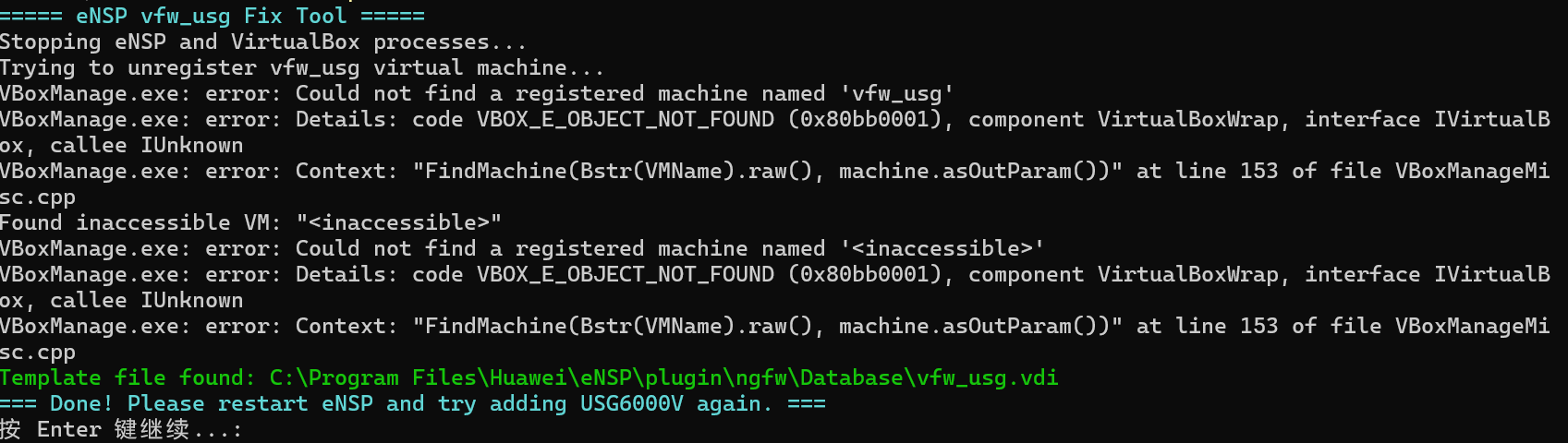 Write-Host "===== eNSP vfw_usg Fix Tool =====" -ForegroundColor Cyan# Check if run as admin