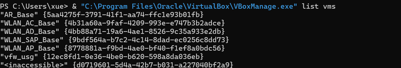 & "C:\Program Files\Oracle\VirtualBox\VBoxManage.exe" list vms
