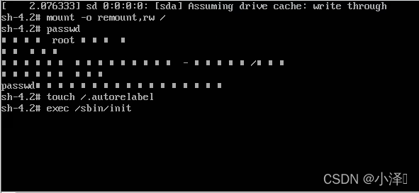 ⑤在光标闪烁的位置输入touch /.autorelabel回车后再输入exec /sbin/init回车,完成后系统会自动重启,密码生效