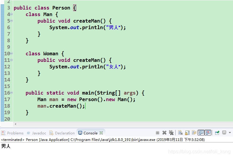 1.非静态内部类,必须有一个外部类的引用才能创建:Man man = new Person().new Man();