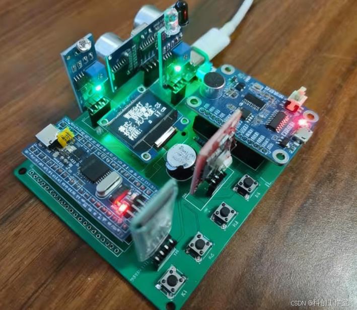 - OLED显示屏:实时显示系统状态、工作模式、光照强度、距离数据等