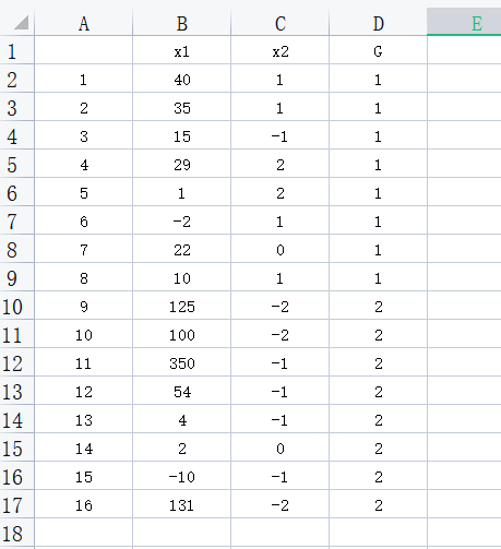 习题3:某银行从历史贷款客户中随机抽取16个样本,根据设计的指标体系分别计算他们的商业信用支持度X1和市场竞争地位等级X2。类别变量记中1代表贷款成功,2代表贷款失败数据,如表所示。完成习题
