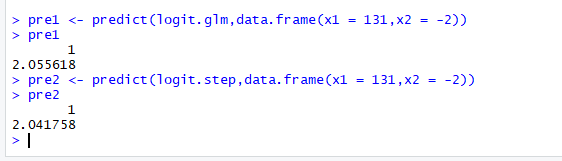 pre2 <- predict(logit.step,data.frame(x1 = 131,x2 = -2))