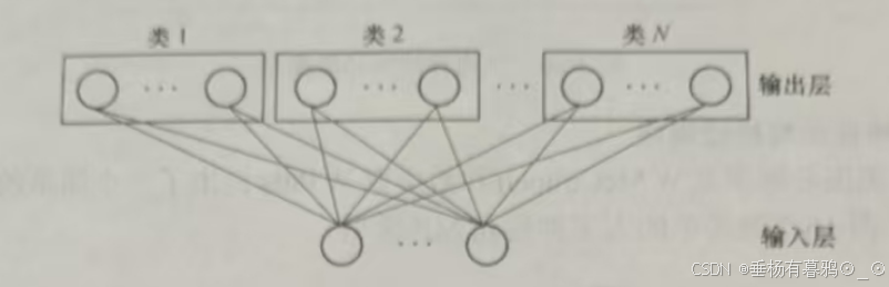 基本思想是:对于来自训练集中的样本向量,如果样本与最近神经元属同一类,则无需学习,否则将惩罚分类错误的神经元,奖励分类正确的神经元。竞争层将自动学习对输入向量进行分类,这种分类的结果仅仅依赖于输入向量之间的距离。如果两个输入向量之间特别相近,竞争层就把它们分在同一类。LVQ网络含竞争层和目标分类层。其拓扑图如图