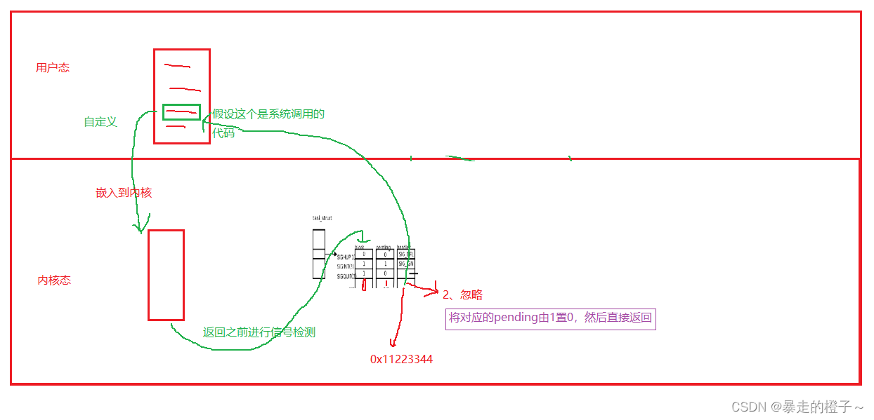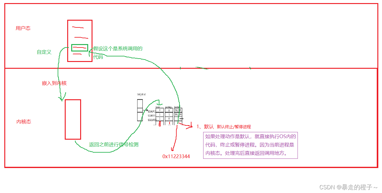 第一个交点:在执行主执行流程序中,因为中断、异常、系统调用进入到内核。 在内核处理完异常后,准备返回用户模式之前,先处理当前信号可以抵达的信号(信号检测)。