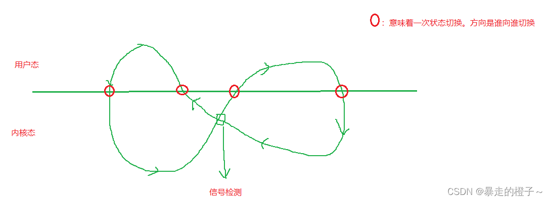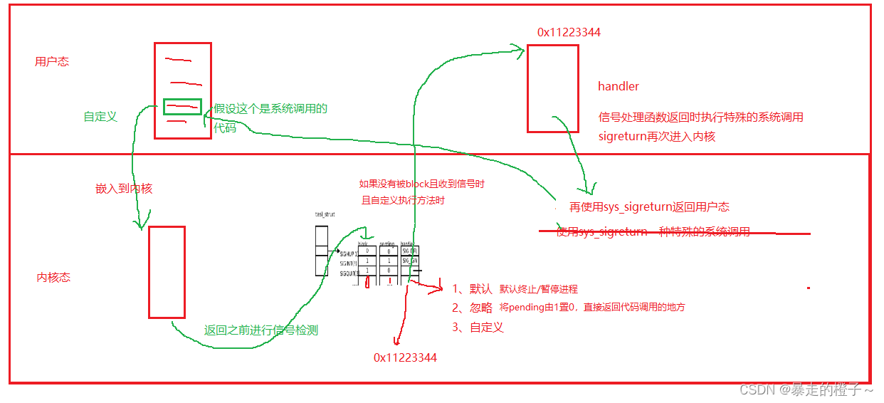 对于信号的捕捉处理动作,代码是在用户态实现的,所以进程要执行自己的处理动作就必须要将身份从内核态转换为用户态,处理完对应的动作后,再使用一个特殊的系统调用sys_sigreturn 将进程身份由用户态转换为内核态,然后再从内核态转换为用户态。(注意,用户态不能直接返回上次主执行流中断的地方)