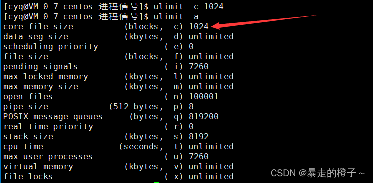 [cyq@VM-0-7-centos 进程信号]$ ulimit -c 1024