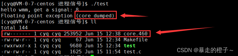 core dump没被打开前运行时是没有这个(core dumped)的提示。并且我们发现该目录下多了一个core.460的文件。这个文件实际就是进程崩溃时在内存上该用户的数据,写入磁盘时创建的文件。