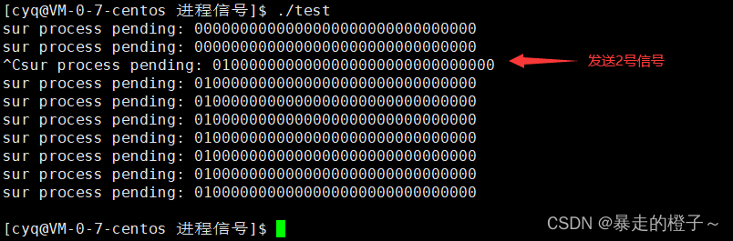 show_pending负责打印位图,我们先屏蔽2号信号,10s后,解除2号信号的屏蔽,我们来看一下这个执行过程: