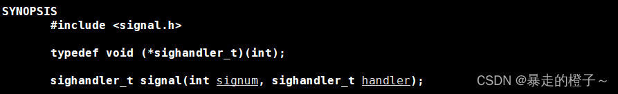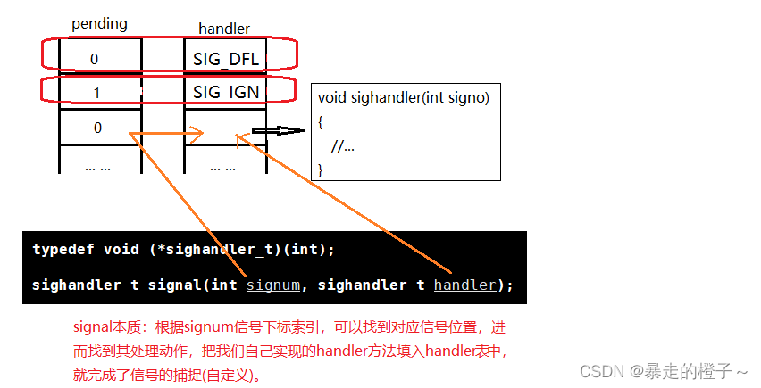 sighandler_t handler:是一个返回值为void,参数是int的函数指针。对捕捉的信号的处理方法。