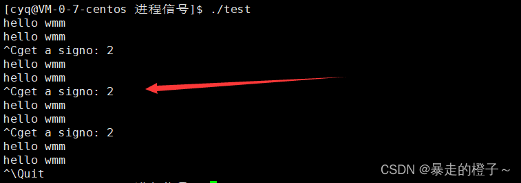 我们使用signal完成对2号信号的自定义处理过程,我们通过键盘ctrl+C看是否可以向进程发送信号