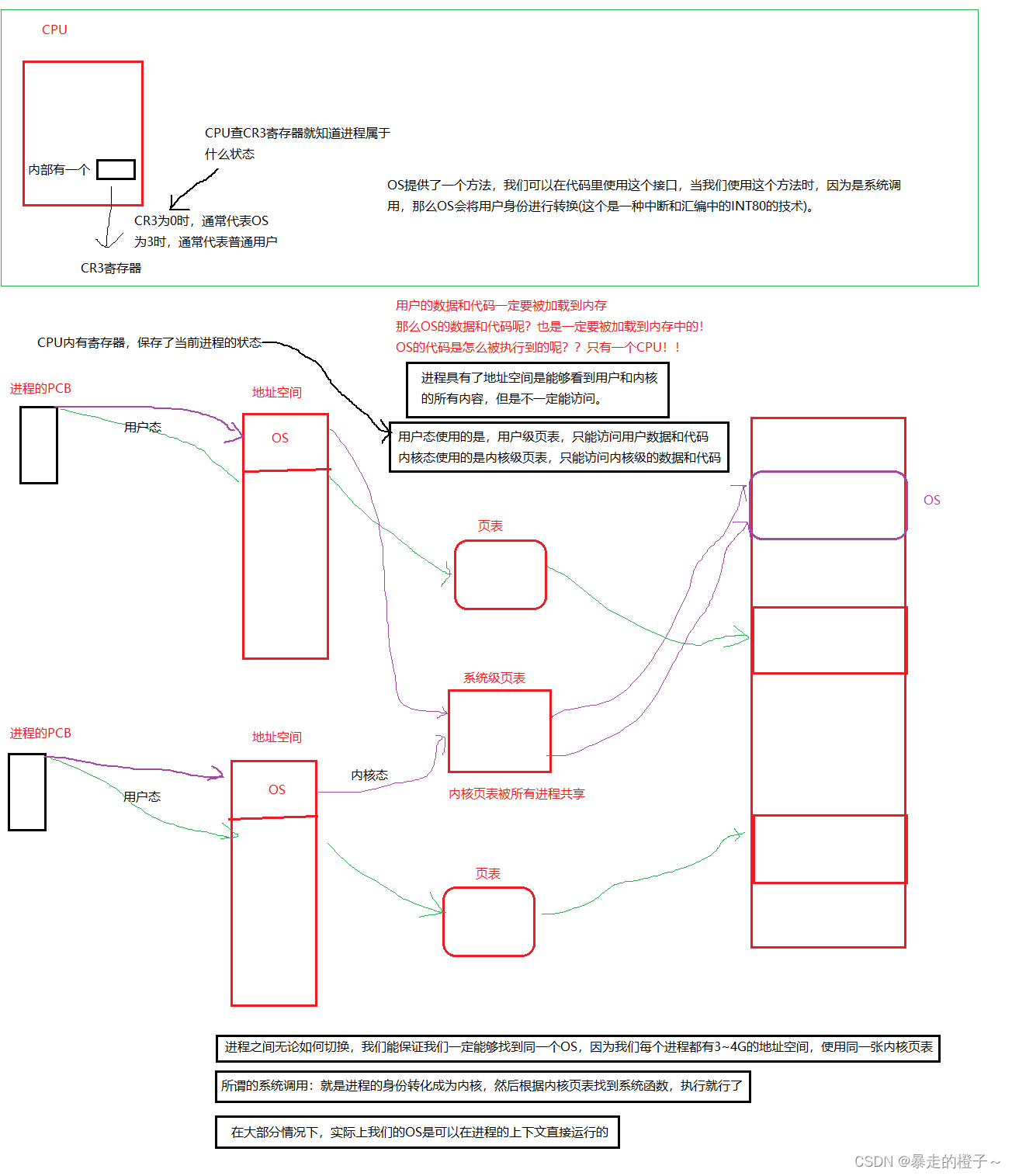 实际上每个进程的地址空间中的内核空间内容都是一样的,它们共用一个内核级页表,这样就可以找到同一个OS的代码和数据了!!