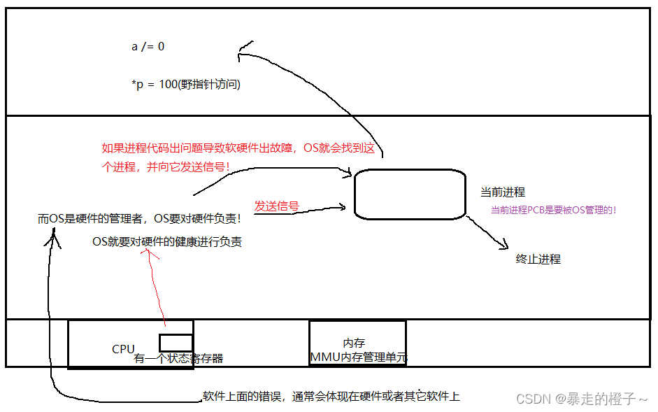 既然OS是硬件的管理者,那么OS就要对硬件的健康进行负责。通常软件上的错误(比如:野指针、除0错误等)通常会体现在硬件上或其他软件上。OS这时候会检测到硬件的异常,然后OS就去找导致问题出现的进程,然后给该进程发送信号,来终止进程。