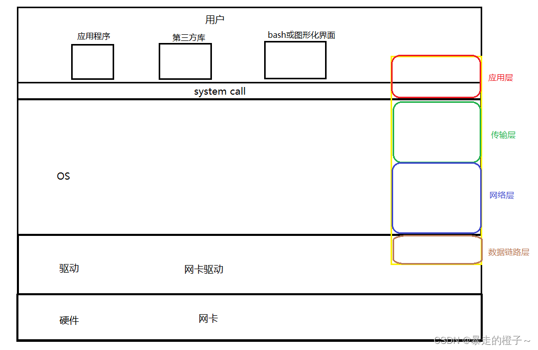 这里的网络,指的是网络协议栈。它是一个软件,贯穿体系结构的tcp/ip,属于OS的一部分。