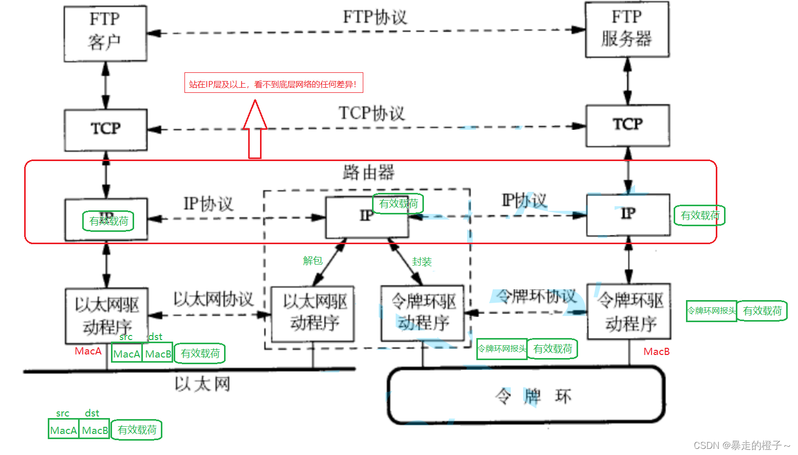 2、上一站从哪里来,下一站去哪里(一直在变化)Mac。因为在数据链路层,经过路由器,一直在进行解包和封装。