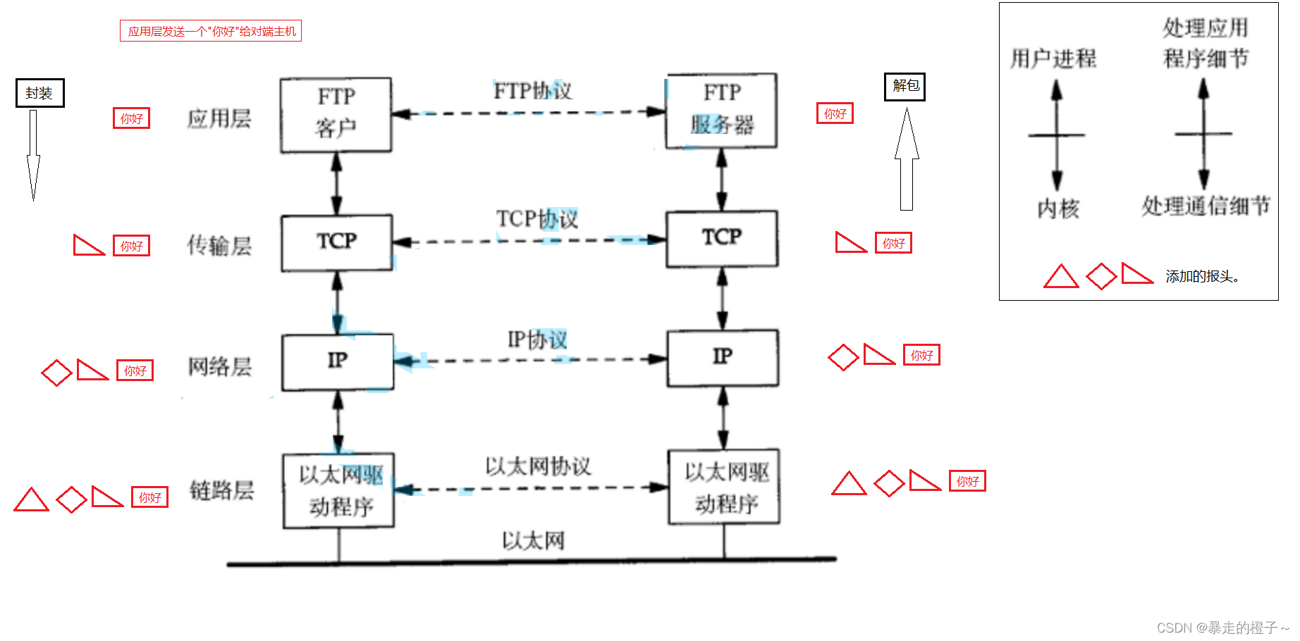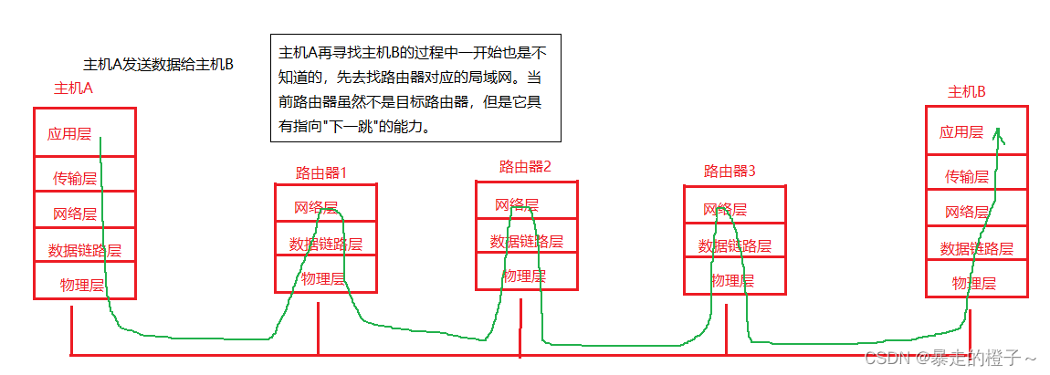 总结:我们发现,数据发送并不是直接从上层直接到对端主机的。中间还有许多查找的过程。只看主机A和主机B的话,数据发送不是从应用层直接到应用层,而是经过封装和解包的过程,是贯穿整个体系结构的!