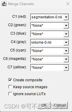 也可以一并显示分割结果。分别打开原数据和分割结果,然后选择Image->Color->Merge Channels,做如下设置,其中分割结果随便选择一个合适的颜色都行,我选的是红色。如果希望还能分别查看原图和分割结果,可以勾选Keep source images。