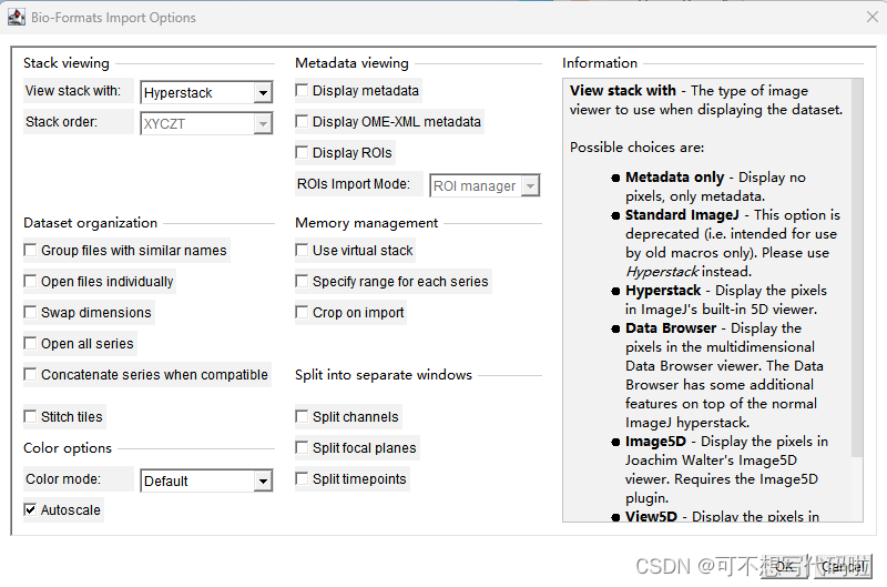 把要查看的图像直接拖进ImageJ也可以查看。不过就只有一个z轴视图可以看,我觉得如果是快速浏览做二维分割也够用了。文件拖进来后有如下页面,不用管直接点OK。