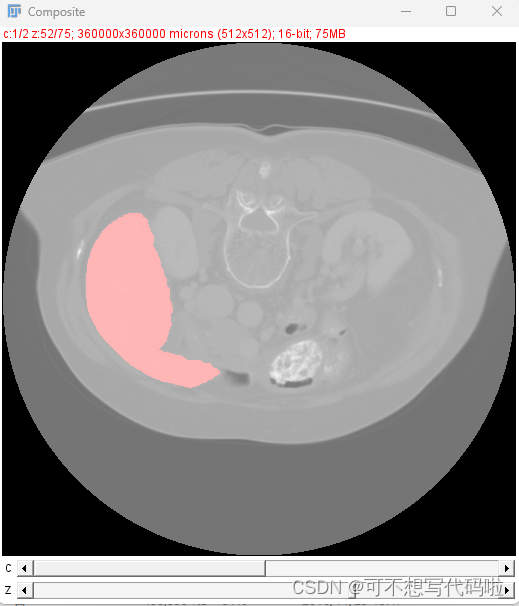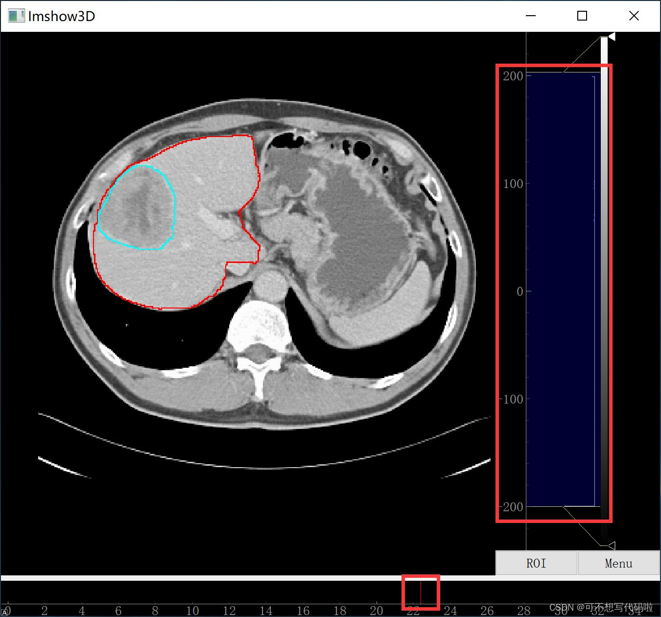 原文:我给出了两个代码,一个是可以同时显示器官、器官分割结果、肿瘤分割结果的,另一个是只显示器官的。当然,大家可以在第一个的基础上做改动。与 ITK-SNAP 不同,在显示的时候只显示分割结果的边界,这样更有利于观察分割的是否合理。并且还可以通过调节上图中右边红框中的滑块来调节图像灰度值的范围,通过调节上图中下方红框中滑块来查看不同横截面的图像。