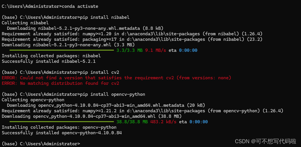 我直接在Pycharm中安装nibabel和cv2会报错,显示无法安装。这时在终端的conda环境中下载即可。