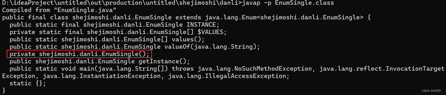 EnumSingle instance1 = (EnumSingle)declaredConstructor.newInstance(new Object[0]);