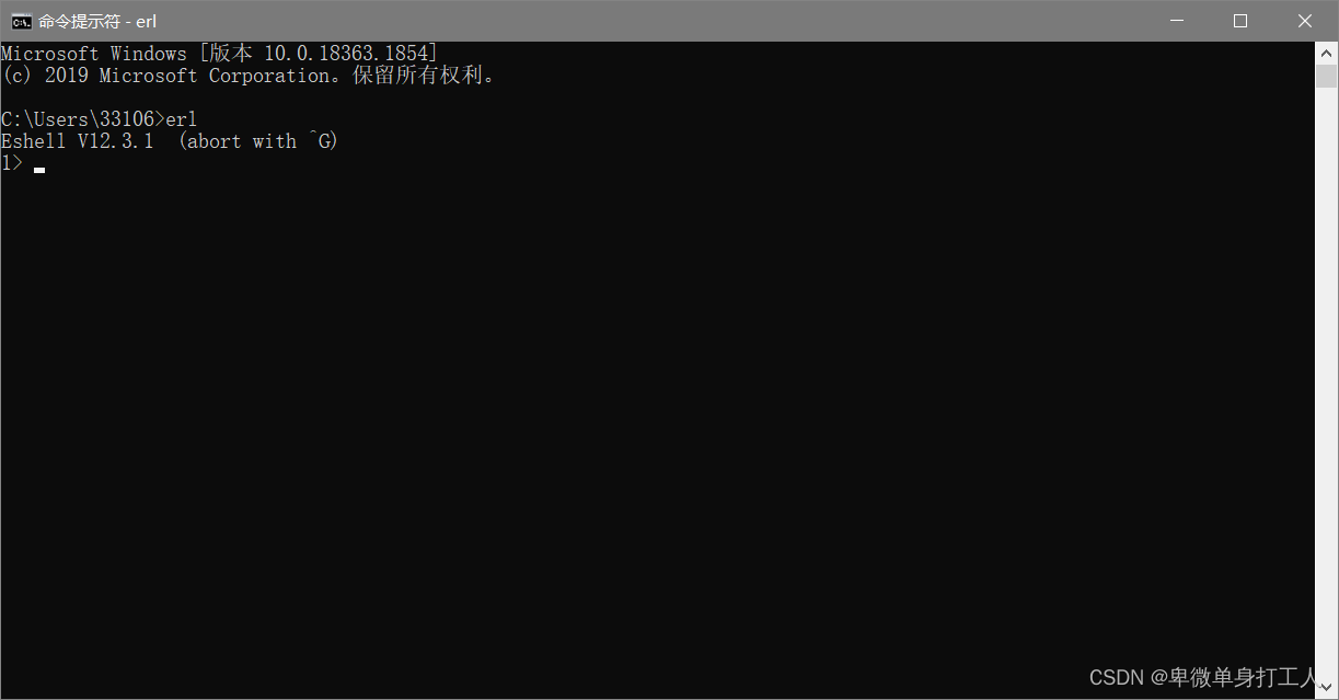 打开cmd,输入erl,如果显示如下,则为安装配置无误,如果出错,就重来: