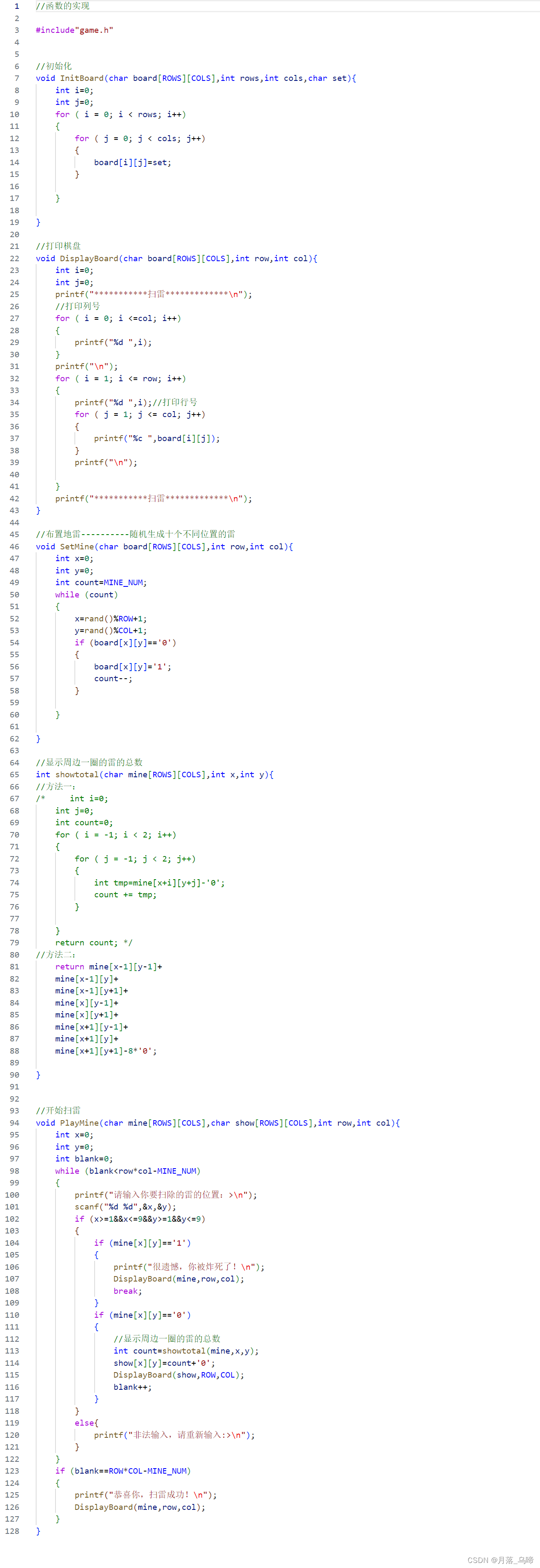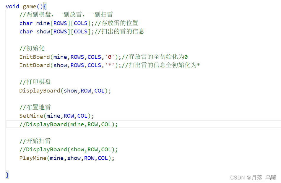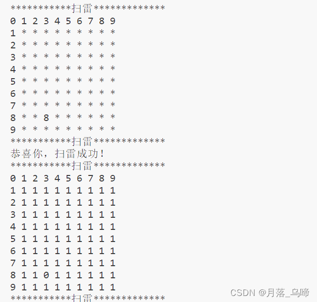 在我们布置地雷的时候,我们可以选择直接将隐藏地图也给打印出来,方便我们测试游戏的逻辑。相对来说,扫雷的胜负判断条件还是比较简单的,只需要判断数组对应位置的字符即可,游戏的进行也是通过不断修改数组中的字符实现的。
