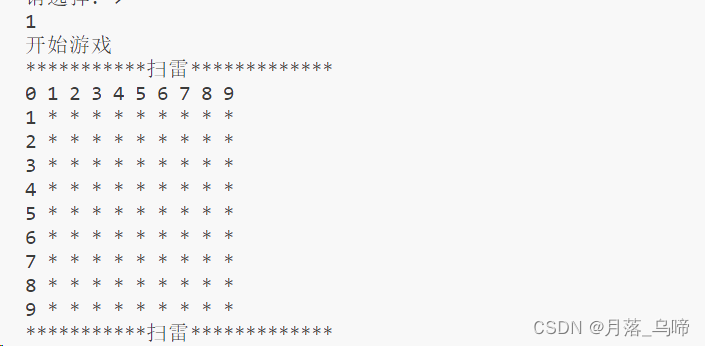 然后便是打印出供我们游戏的地图,其中,为了方便我们在九行九列的地图上输入坐标,我们还将地图对应的行列号分别标在地图的最左边与最上方。