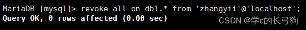 revoke 权限列表 on 库.对象名 from '用户名'@'登陆位置';