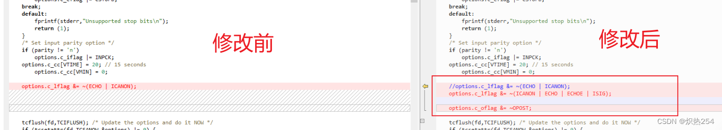 在linux平台下,串口的相关属性都是通过struct termios 结构体来配置的,通过对其中内容进行检查,以及参考相应的文档【linux下串口通信打开正常,发送正常,但是接收不到数据的解决办法_linux串口通信 接收不到数据 reboot 首次接收不到, 设置一下就可以接收-优快云博客】,发现原来是串口输入没有设置为原始模式: