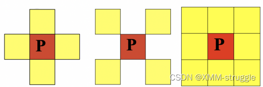 在图像中,最⼩的单位是像素,每个像素周围有8个邻接像素,常⻅的邻接关系有3 种:4邻接、8邻接和D邻接。分别如下图所示: