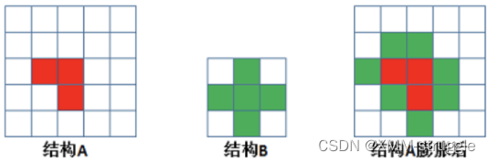 1. 膨胀具体操作是:⽤⼀个结构元素扫描图像中的每⼀个像素,⽤结构元素中的每⼀个像 素与其覆盖的像素做“与”操作,如果都为0,则该像素为0,否则为1。如下图所 示,结构A被结构B腐蚀后: