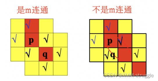 对于具有值V 的像素p和q,如果: q在集合N (p)中,或 q在集合N (p)中,并且N (p)与N (q)的交集为空(没有值V 的像素) 则称这两个像素是m连通的,即4连通和D连通的混合连通。