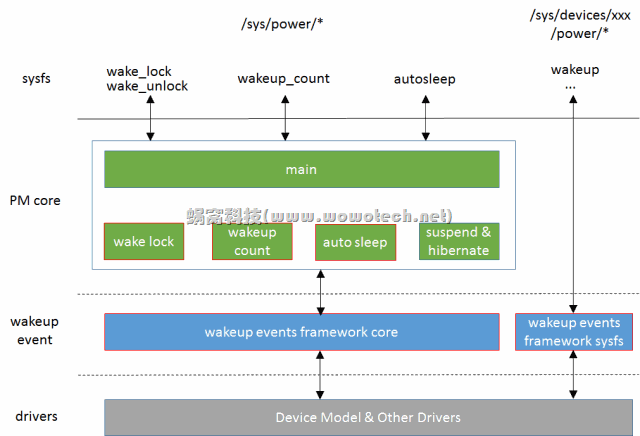 wakeup count的实现位于wakeup events framework中(drivers/base/power/wakeup.c),主要为两个模块提供接口:通过PM core向用户空间提供sysfs接口;直接向autosleep(请参考下一篇文章)提供接口。