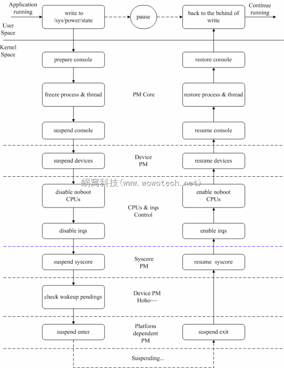 内核中,Suspend及Resume过程涉及到PM Core、Device PM、各个设备的驱动、Platform dependent PM、CPU control等多个模块,涉及了console switch、process freeze、CPU hotplug、wakeup处理等过个知识点。