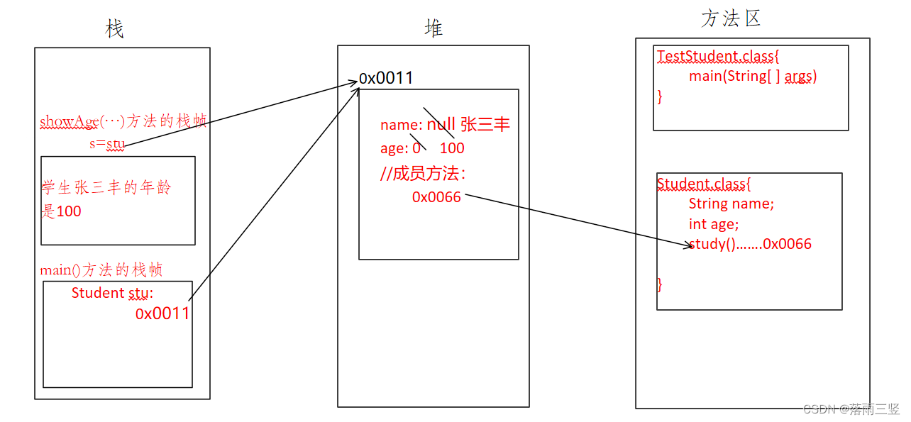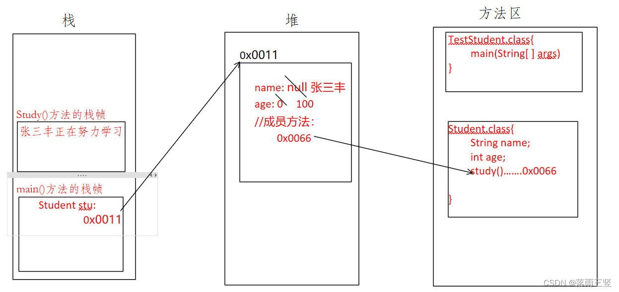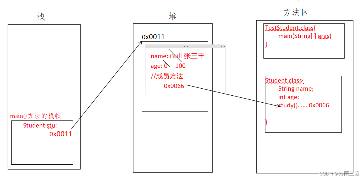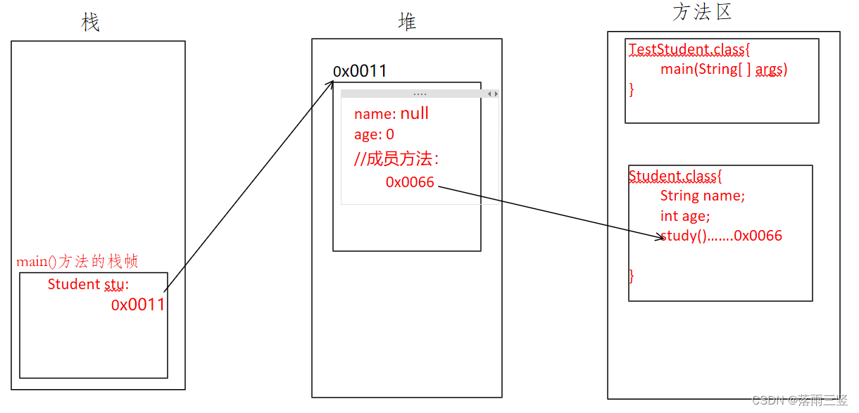 代码碰到new,随即向堆中申请开辟一个空间用来储存创建的对象信息。假设这个空间的地址为0x0011,随即将这个地址值传给stu。这个在堆中开辟的值会被分为三分,前两份用来储存创建对象的成员变量,此时成员变量的值为默认值。后一个用来储存成员方法的study()的地址值,这个地址值就是Student类字节码在方法区中加载时,方法区赋给study()方法的地址值。