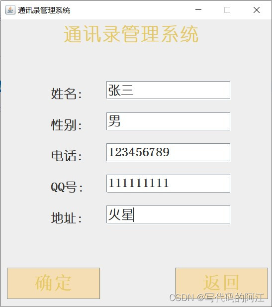public static boolean addFileContent(String content) {//信息增添功能 BufferedWriter bw = null; try { bw = new BufferedWriter(new OutputStreamWriter(new FileOutputStream("..\\通讯录管理系统\\src\\通讯录管理系统\\data.txt"), "gb2312")); bw.write(content); bw.flush(); } catch (Exception e) { e.printStackTrace(); return false; } finally { if (bw != null) { try { bw.close(); } catch (IOException e) { bw = null; } } } return true; }