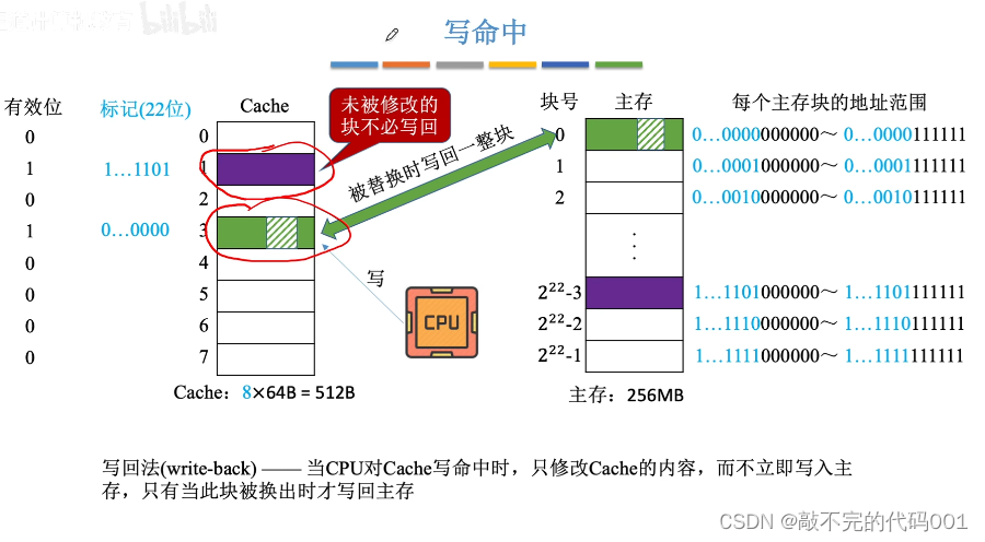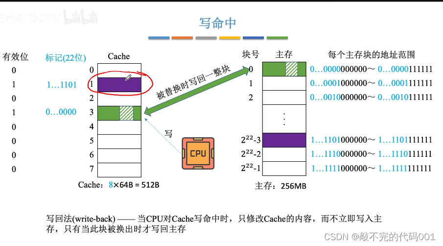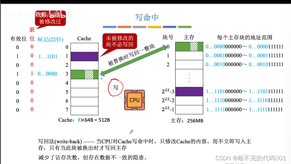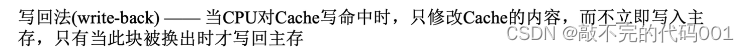 CPU只写入相应的数据,主存的数据母本和Cache的副本不一致,但是这种不一致只有在这个Cache行下次被替换的时候才会把整个Cache行里一整块的数据全部写回主存