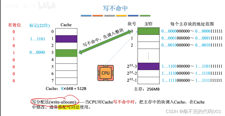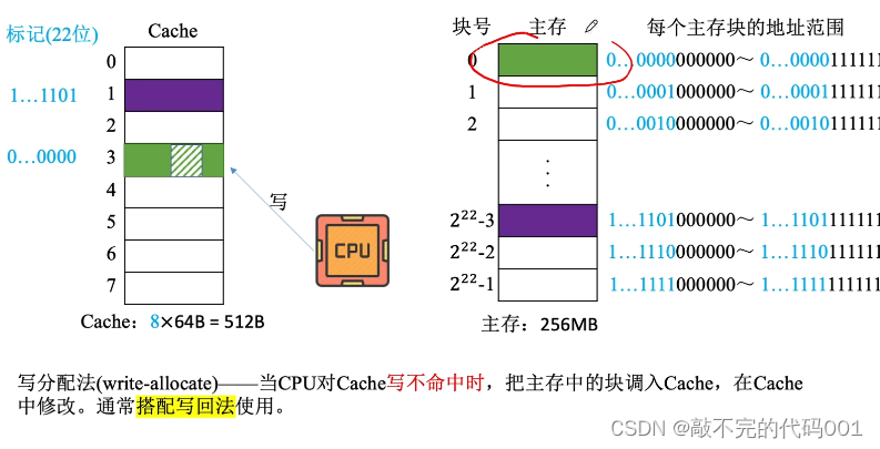 当CPU要访问的地址没命中,若采用写分配法,就会先把CPU当前要写的这一块数据先调到Cache中,然后CPU对Cache进行写操作,也就是说主存里的数据保持不动,CPU只是修改了其数据副本