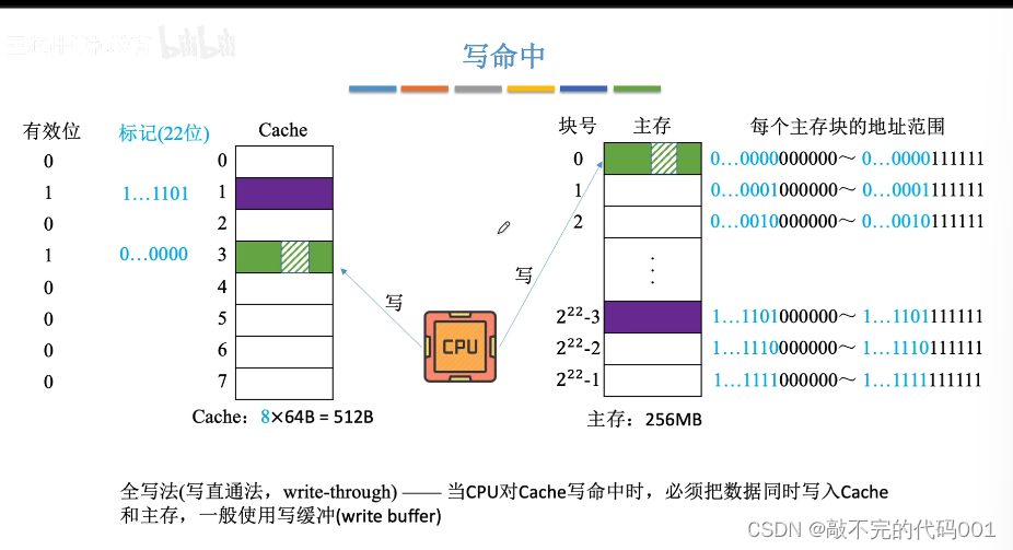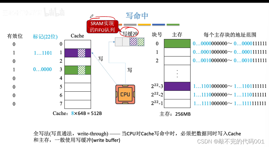 当CPU对某个地址进行写操作并且这个地址命中的时候,首先向Cache写入这个数据,另外也会往写缓冲里写入相应的数据