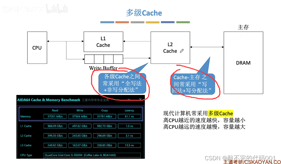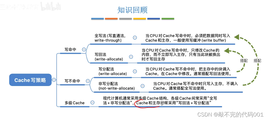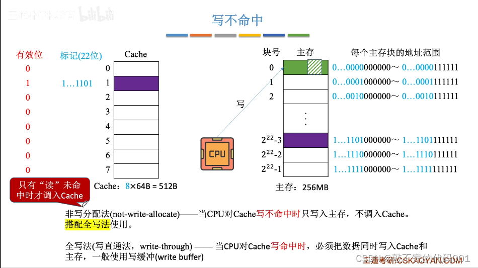 当CPU相要写的地址没命中时,此时CPU会直接往主存写数据而不会把这一块的内容调入Cache,所以非写分配法一般搭配之前提到的全写法来使用,采用这种方法的话,意味着只有CPU对某个地址进行读操作,读操作未命中的情况下才会把相应的主存快调入Cache,而写操作未命中, CPU会直接写而不会调入Cache