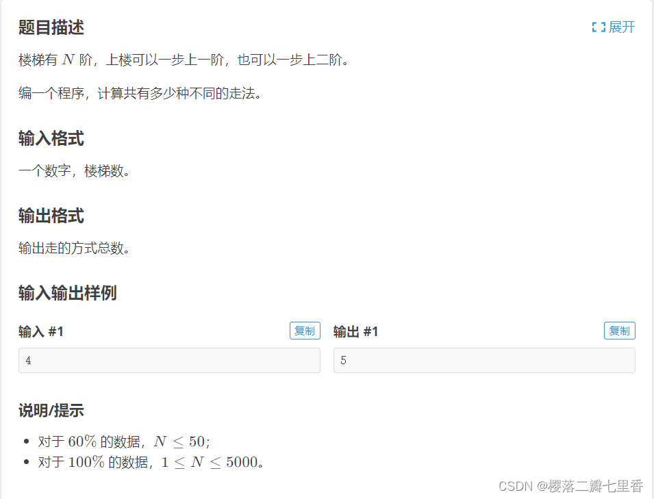 分析 : 用斐波那契数列来解即可, f[i] 表示从1走到 i 的方案数, 属性为数量, 一次可上1步或2步