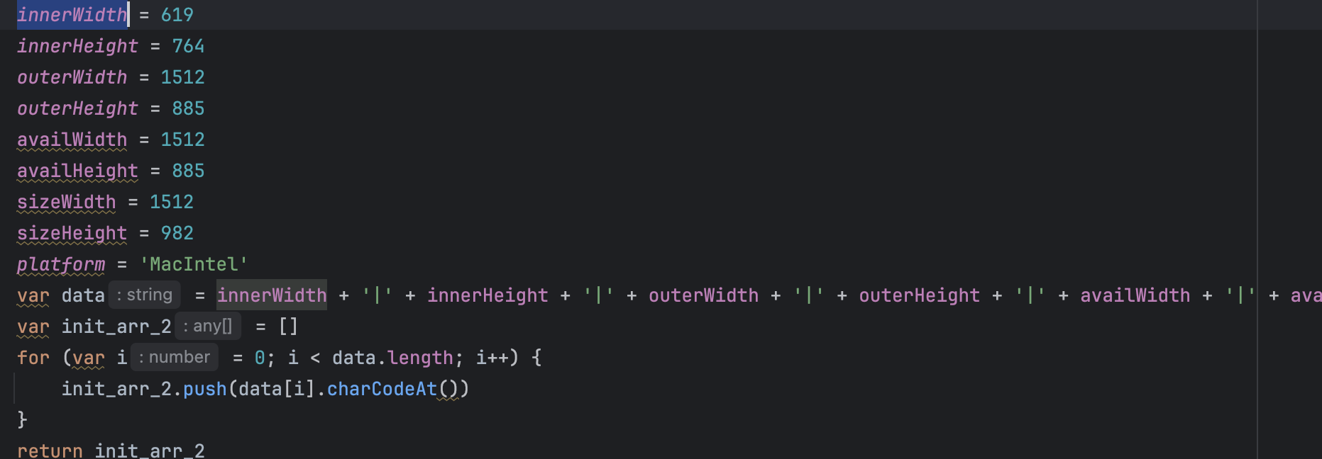 通过搜索,快速定位到如图位置,发现最初是50位数组,然后50位数组拼接43位数组拼接3位数组拼接1位数组,得到最后的结果,其中43位数组是环境得到的