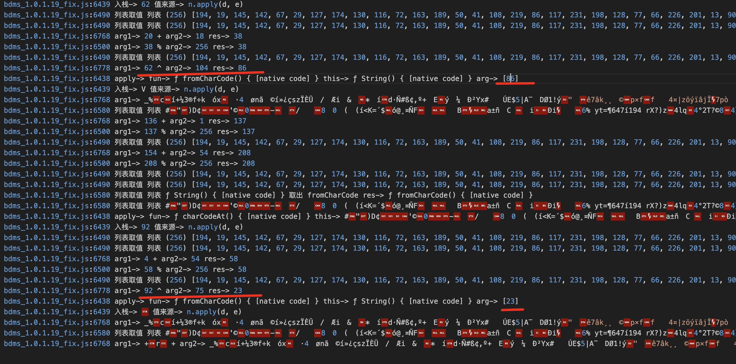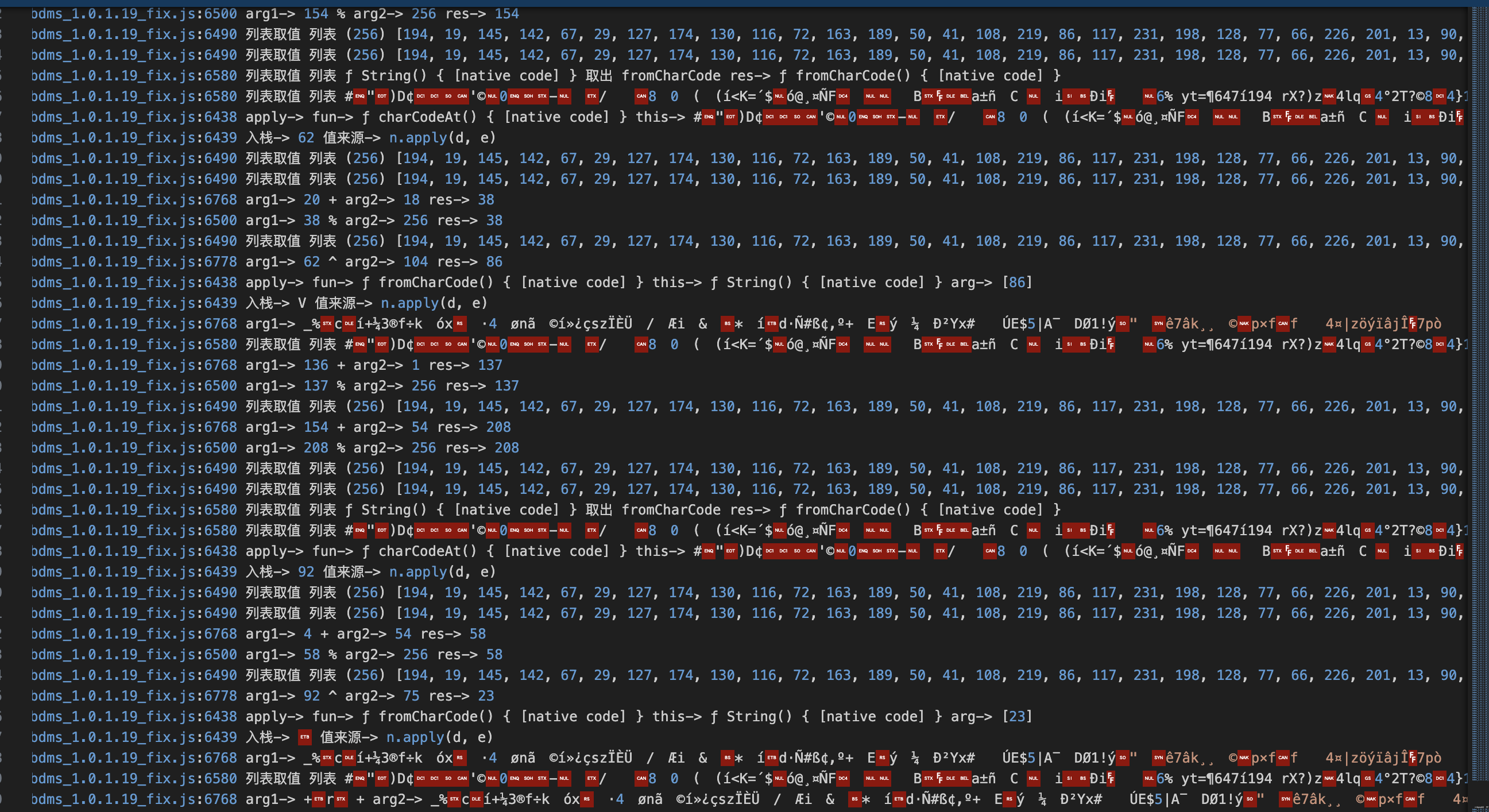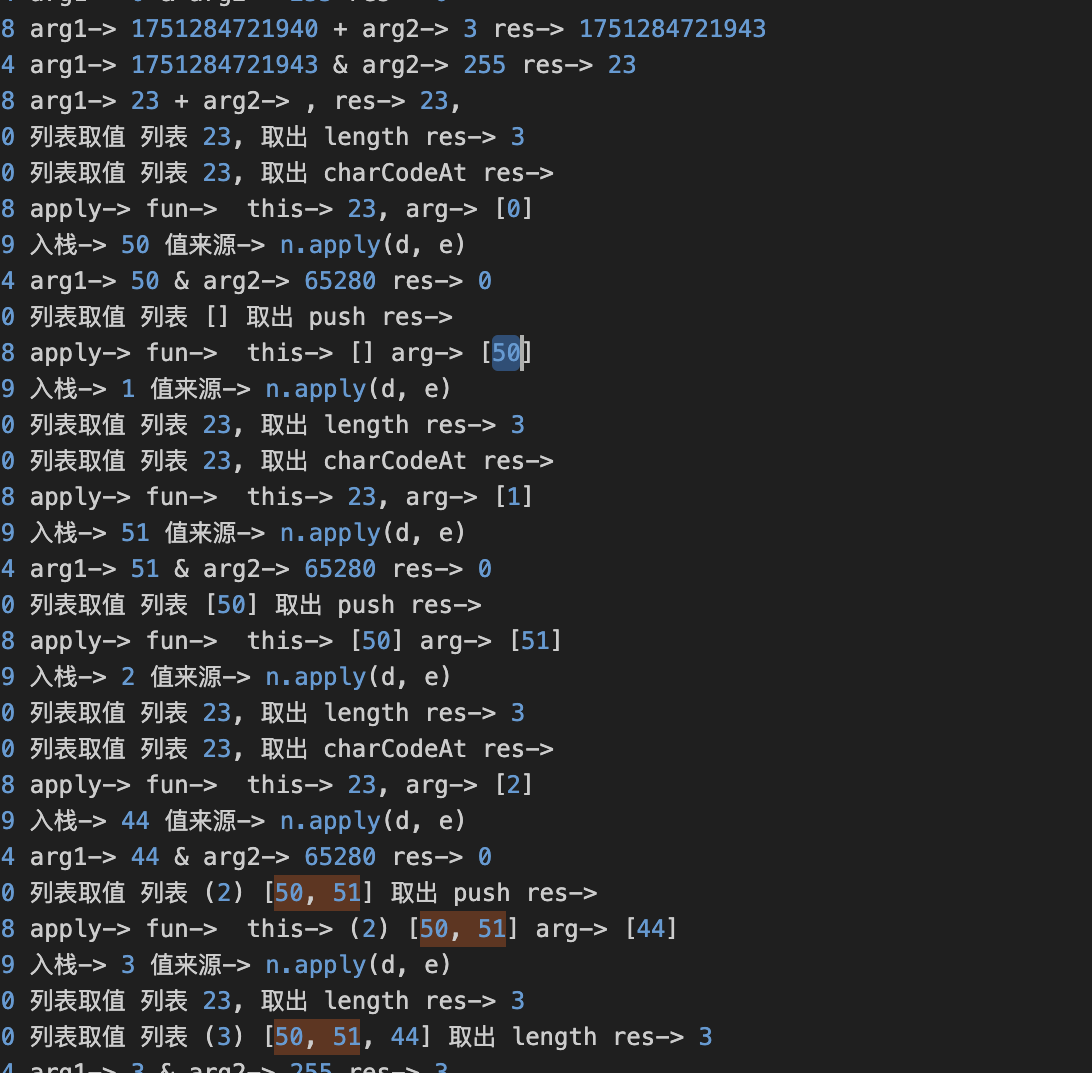 倒着看,会发现很乱,静下心慢慢就发现,这部分其实是在拼接这个乱码,然后这个乱码用于后面的base64,所以我们根据日志遍拿到了后面base64的字节数组(直接用乱码是不行的)