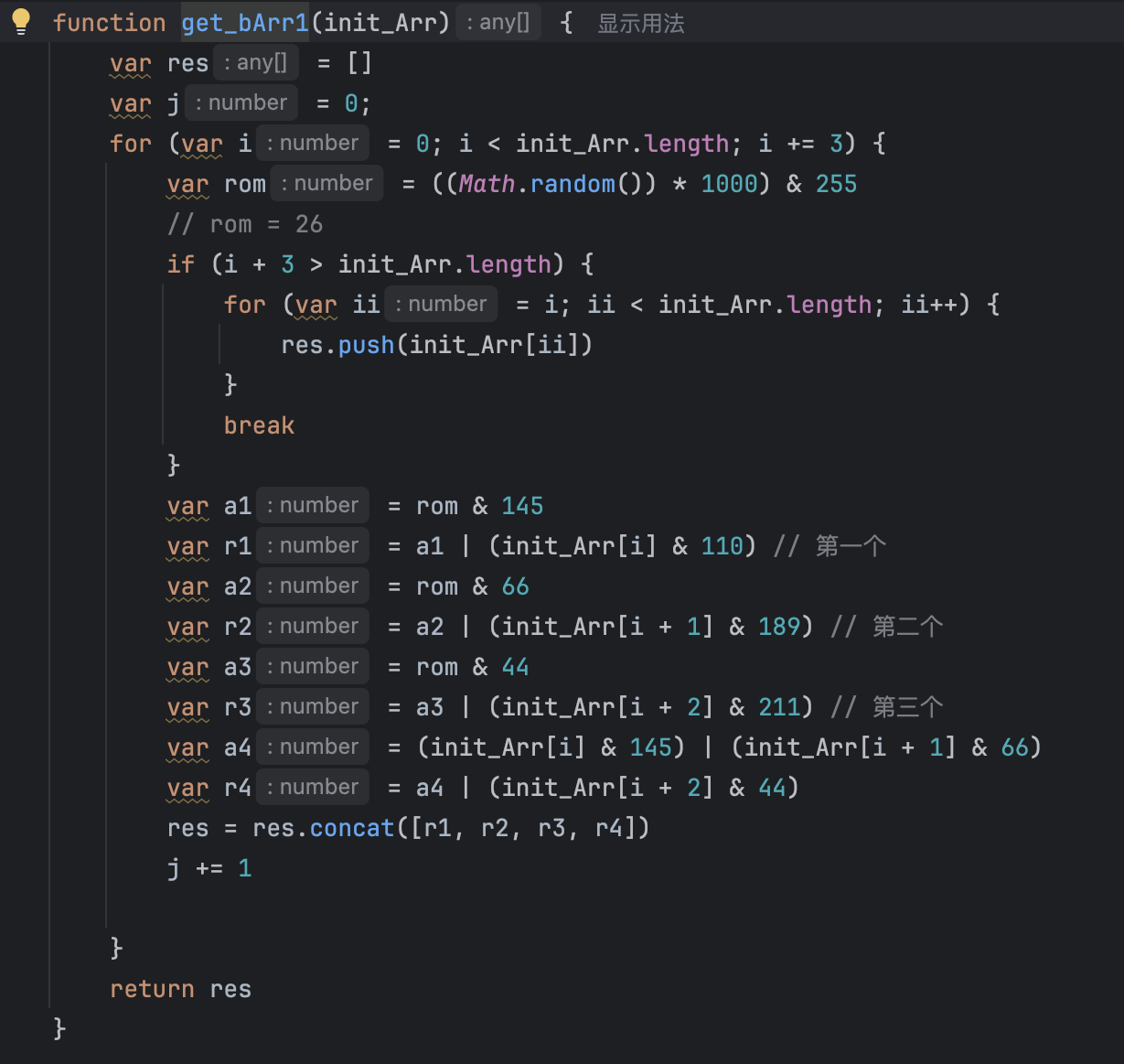 可以根据日志发现,127位数组是进行了一些运算,类似base64,每次取3位,最后得到4位的结果,实现如下,所以关键的是97位数组的生成