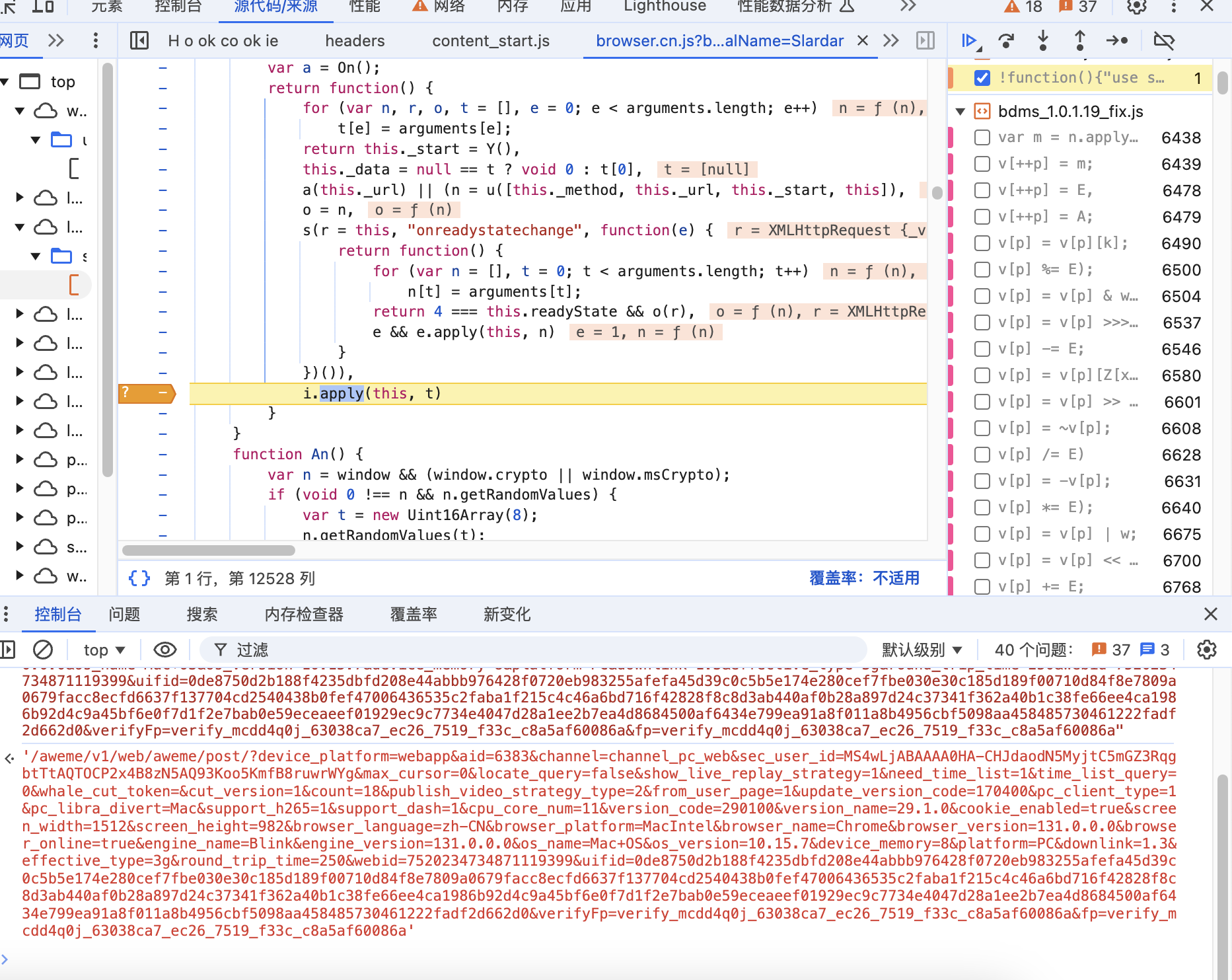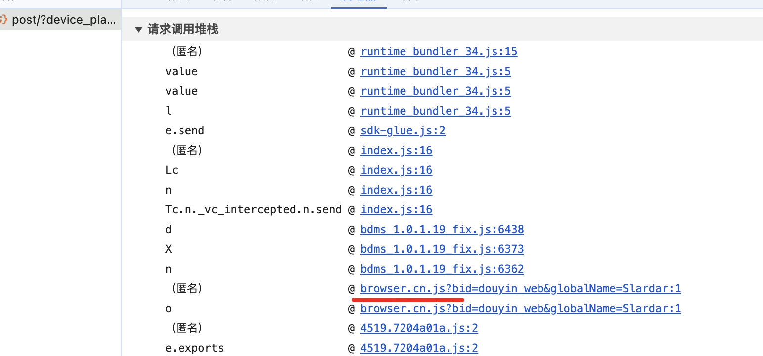 熟悉某音的知道,bdms是主要加密的文件,找到上一个栈的位置打上下面的条件断点