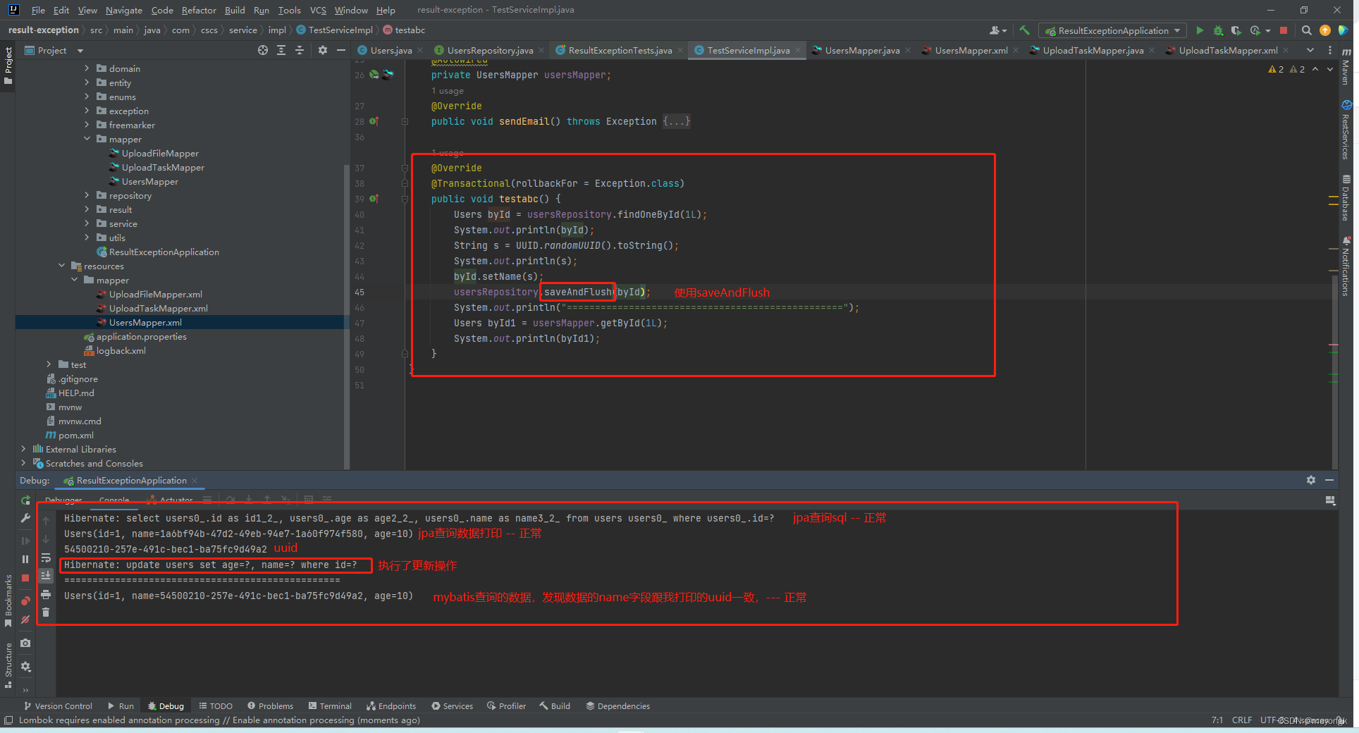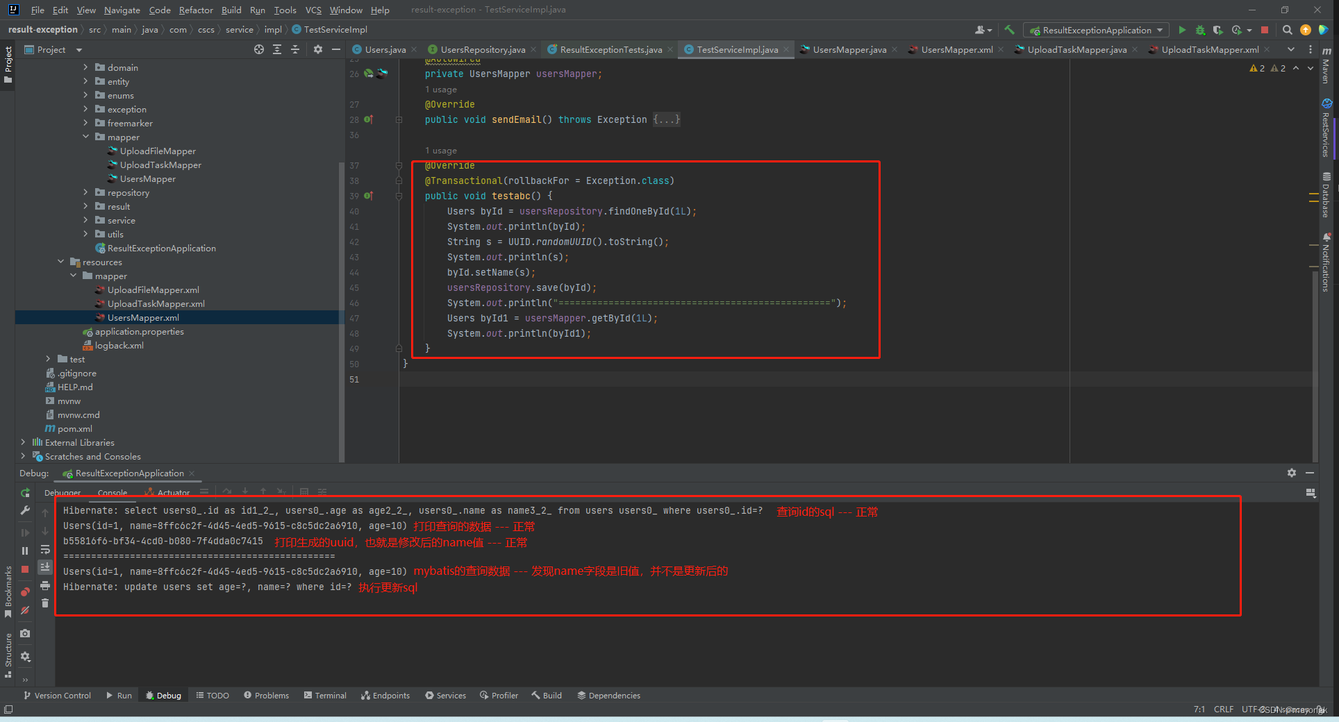 代码很简单,我先根据id查询一条数据,然后将name字段改为随机生成的uuid,然后使用jpa进行save操作,由于是有id的,所以save就是更新数据,然后打印了一个分割线,然后再使用mybatis查询这个id,请注意第二次查询,我是使用的mybatis